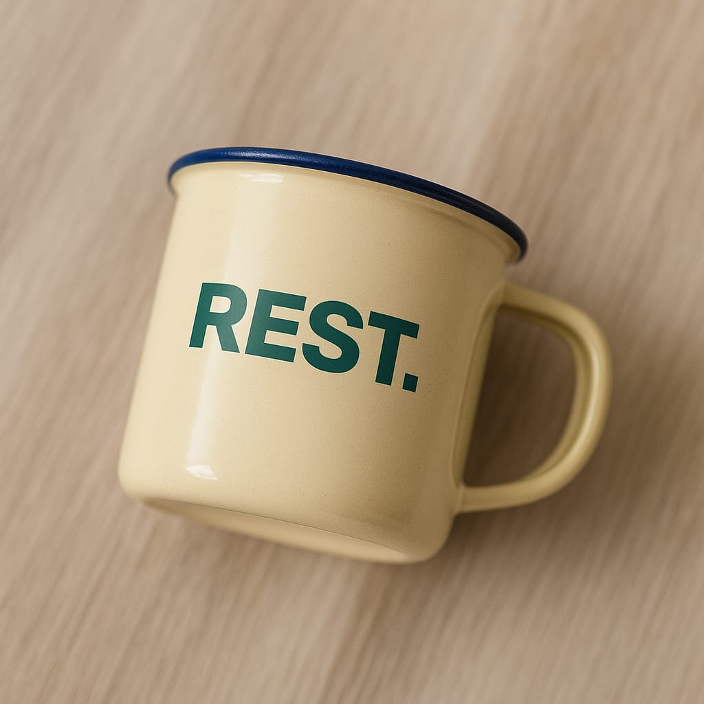 This oatmeal enamel espresso mug features our 'REST.' logo in deep green, giving quiet strength to your morning ritual. It’s the same soft oatmeal tone as our tees, designed to tie your favourite recovery pieces together, whether you’re brewing at home or filling up from your camp stove.